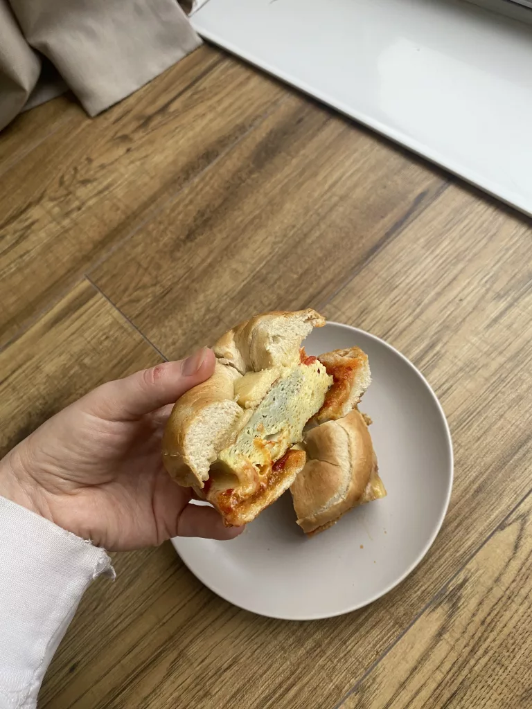 At the heart of this bagel is a fluffy egg frittata, loaded with vibrant veggies for a nutritious boost. A layer of smoky, melted cheese adds richness, while a dollop of fiery-sweet chili jam brings a perfect balance of heat and sweetness. All sandwiched between a bagel, this combo creates a breakfast that’s as delicious as it is convenient.